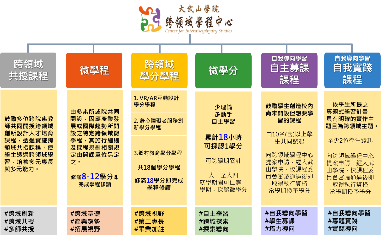 提供學生跨領域學習管道、培養多元專長與多元能力;推展跨領域「教」「學」,規劃並開設各種跨領域課程、跨領域學分學程、自主學習及自我導向學習課程,進行跨領域對話、科際交流。